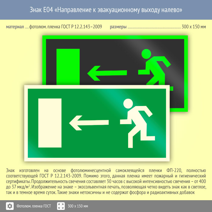 Знак E04 «Направление к эвакуационному выходу налево» (фотолюминесцентная пленка ГОСТ 34428-2018, 300х150 мм) в Лобне купить