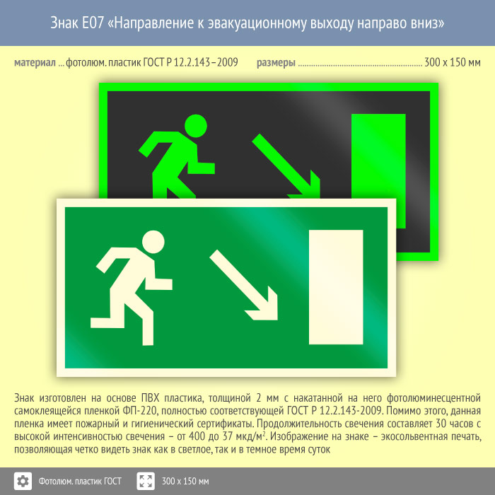 Знак E07 «Направление к эвакуационному выходу направо вниз» (фотолюминесцентный пластик ГОСТ 34428-2018, 300х150 мм) в Лобне купить