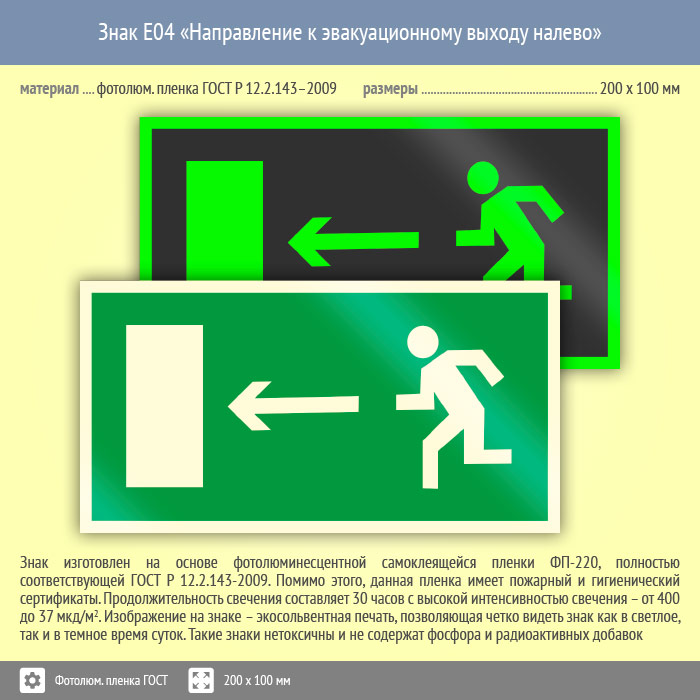 Знак E04 «Направление к эвакуационному выходу налево» (фотолюминесцентная пленка ГОСТ 34428-2018, 200х100 мм) в Лобне купить