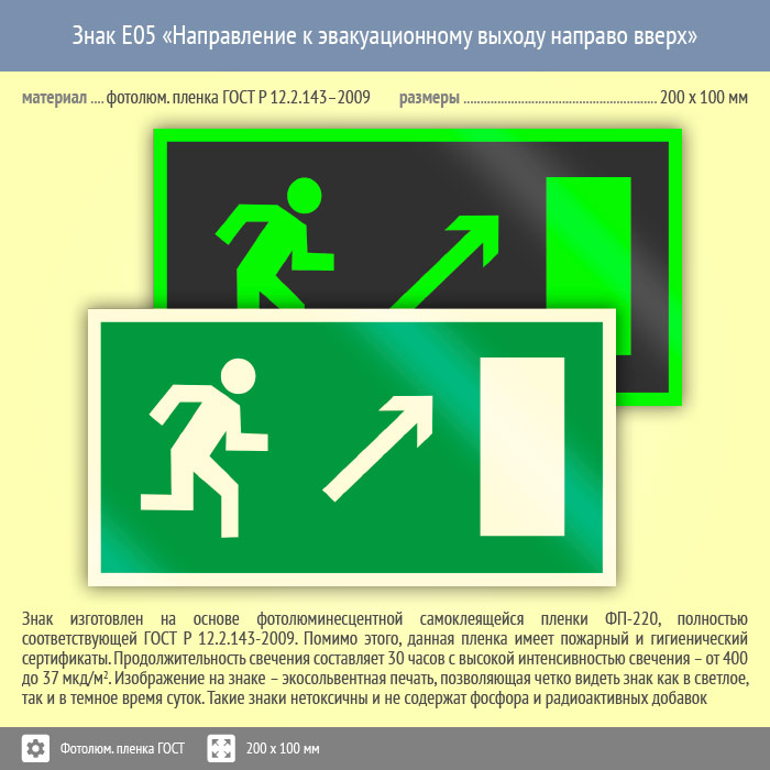 Знак E05 «Направление к эвакуационному выходу направо вверх» (фотолюминесцентная пленка ГОСТ 34428-2018, 200х100 мм) в Лобне купить