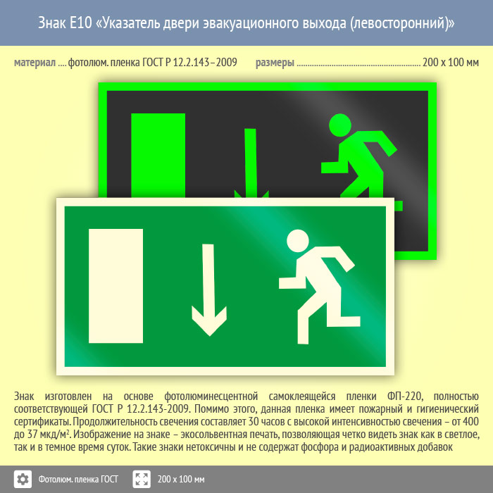 Знак E10 «Указатель двери эвакуационного выхода (левосторонний)» (фотолюминесцентная пленка ГОСТ 34428-2018, 200х100 мм) в Лобне купить