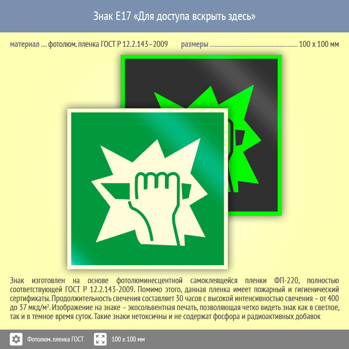 Знак E17 «Для доступа вскрыть здесь» (фотолюминесцентная пленка ГОСТ 34428-2018, 100х100 мм) в Лобне купить