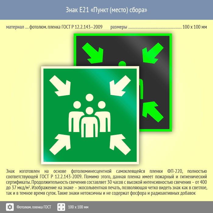 Знак E21 «Пункт (место) сбора» (фотолюминесцентная пленка ГОСТ 34428-2018, 100х100 мм) в Лобне купить