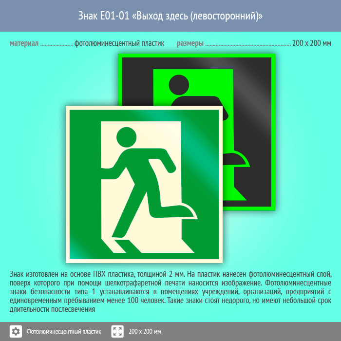 Знак E01-01 «Выход здесь (левосторонний)» (фотолюминесцентный пластик, 200х200 мм) в Лобне купить