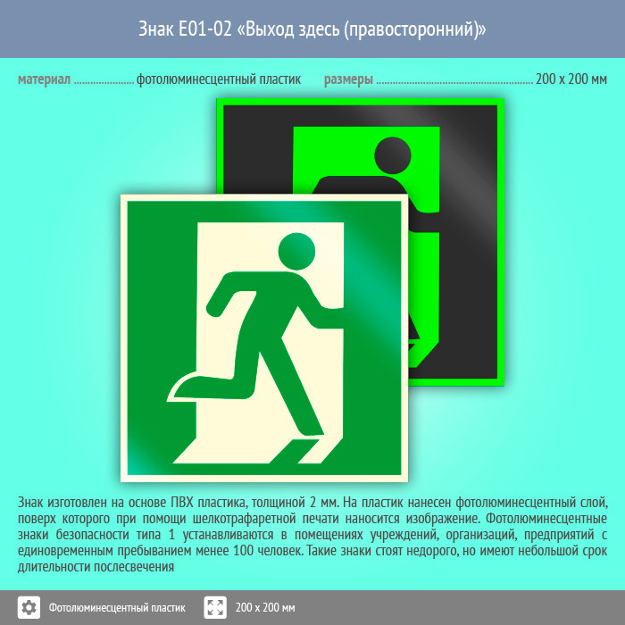 Знак E01-02 «Выход здесь (правосторонний)» (фотолюминесцентный пластик, 200х200 мм) в Лобне купить