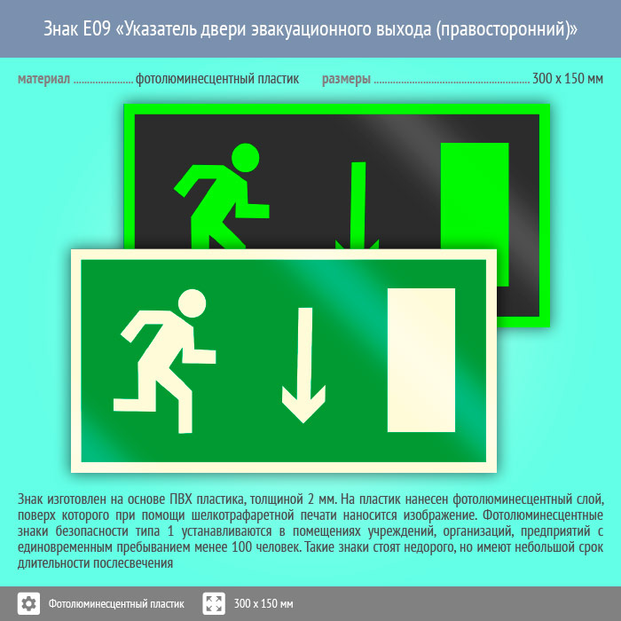 Знак E09 «Указатель двери эвакуационного выхода (правосторонний)» (фотолюминесцентный пластик, 300х150 мм) в Лобне купить