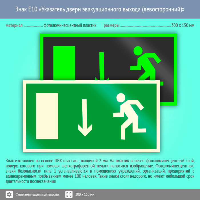 Знак E10 «Указатель двери эвакуационного выхода (левосторонний)» (фотолюминесцентный пластик, 300х150 мм) в Лобне купить