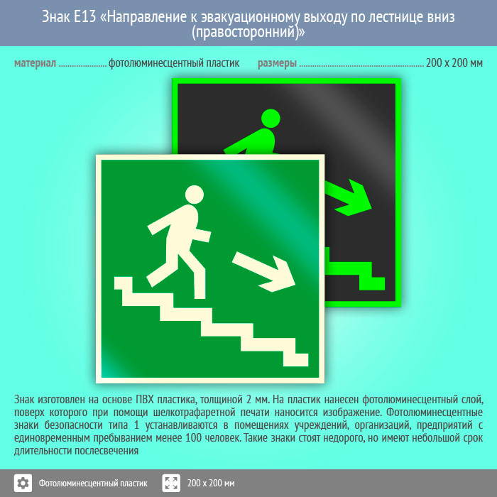 Знак E13 «Направление к эвакуационному выходу по лестнице вниз (правосторонний)» (фотолюминесцентный пластик, 200х200 мм) в Лобне купить