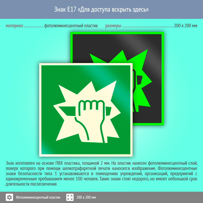 Знак E17 «Для доступа вскрыть здесь» (фотолюминесцентный пластик, 200х200 мм) в Лобне купить