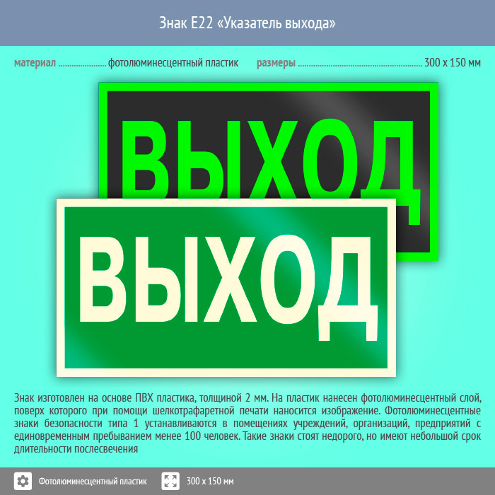 Знак E22 «Указатель выхода» (фотолюминесцентный пластик, 300х150 мм) в Лобне купить