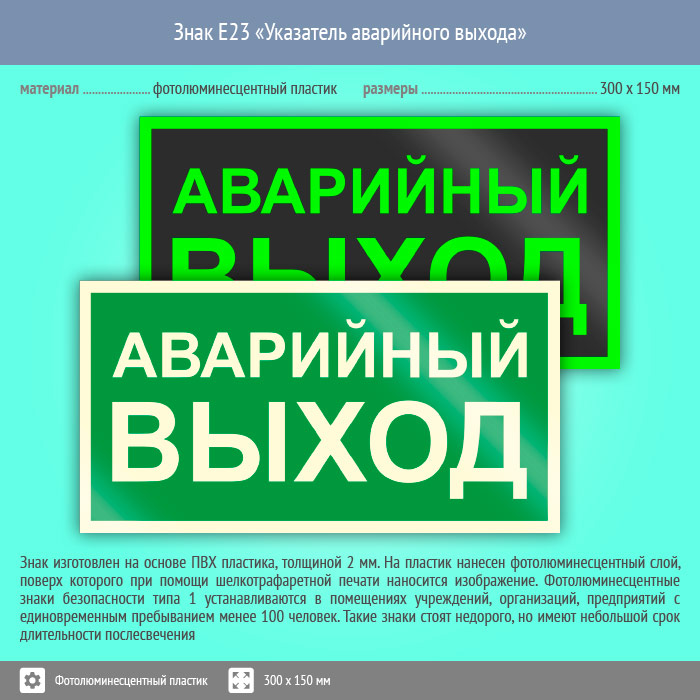Знак E23 «Указатель аварийного выхода» (фотолюминесцентный пластик, 300х150 мм) в Лобне купить