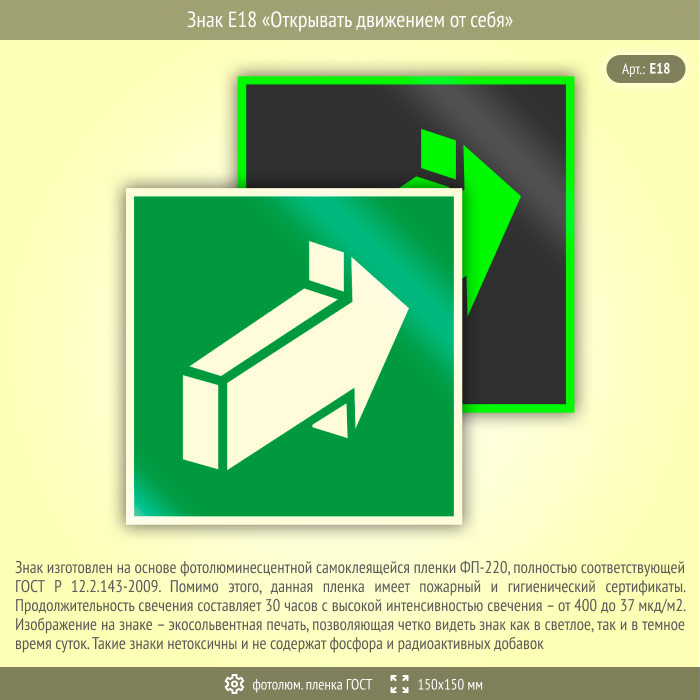 Знак E18 «Открывать движением от себя» (фотолюминесцентная пленка ГОСТ 34428-2018, 150х150 мм) в Лобне купить