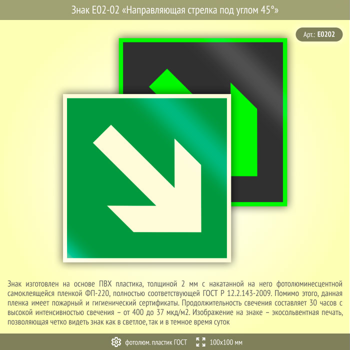 Знак E02-02 «Направляющая стрелка под углом 45°» (фотолюминесцентный пластик ГОСТ 34428-2018, 100х100 мм) в Лобне купить