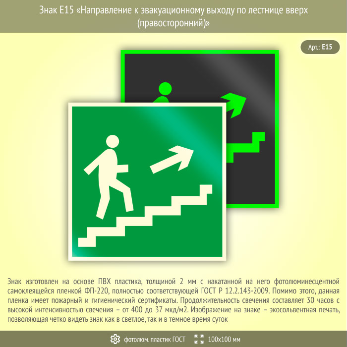 Знак E15 «Направление к эвакуационному выходу по лестнице вверх (правосторонний)» (фотолюминесцентный пластик ГОСТ 34428-2018, 100х100 мм) в Лобне купить