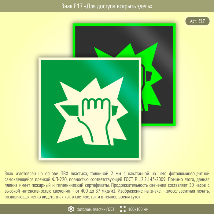 Знак E17 «Для доступа вскрыть здесь» (фотолюминесцентный пластик ГОСТ 34428-2018, 100х100 мм) в Лобне купить
