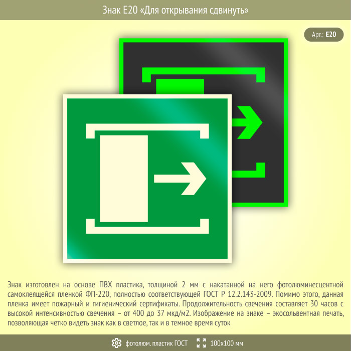 Знак E20 «Для открывания сдвинуть» (фотолюминесцентный пластик ГОСТ 34428-2018, 100х100 мм) в Лобне купить