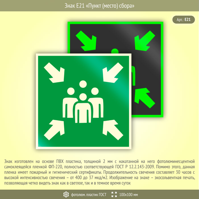 Знак E21 «Пункт (место) сбора» (фотолюминесцентный пластик ГОСТ 34428-2018, 100х100 мм) в Лобне купить