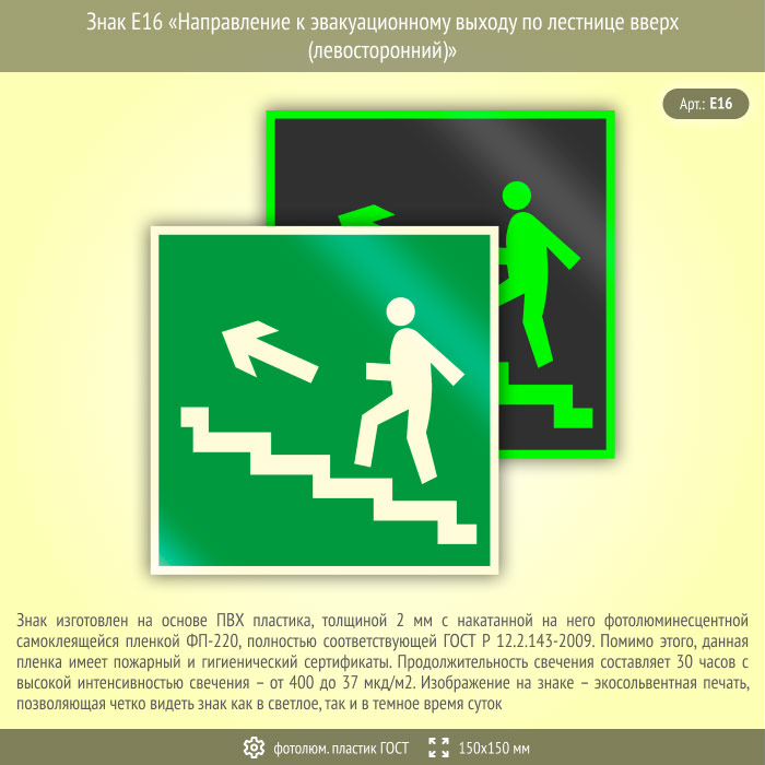 Знак E16 «Направление к эвакуационному выходу по лестнице вверх (левосторонний)» (фотолюминесцентный пластик ГОСТ 34428-2018, 150х150 мм) в Лобне купить