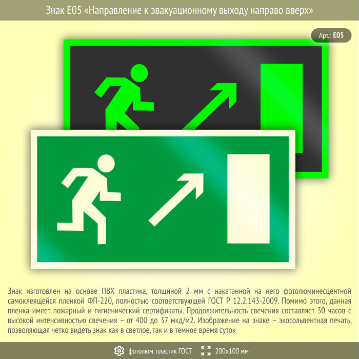 Знак E05 «Направление к эвакуационному выходу направо вверх» (фотолюминесцентный пластик ГОСТ 34428-2018, 200х100 мм) в Лобне купить
