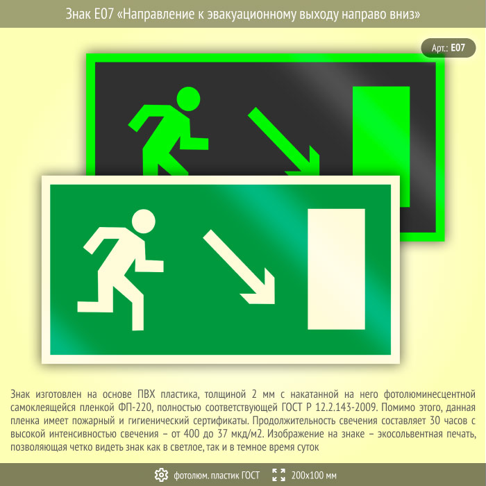 Знак E07 «Направление к эвакуационному выходу направо вниз» (фотолюминесцентный пластик ГОСТ 34428-2018, 200х100 мм) в Лобне купить