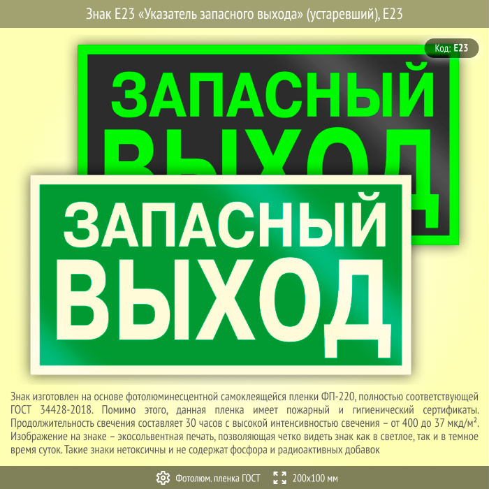 Знак E23 «Указатель запасного выхода» (устаревший) (фотолюминесцентная пленка ГОСТ 34428-2018, 200х100 мм) в Лобне купить