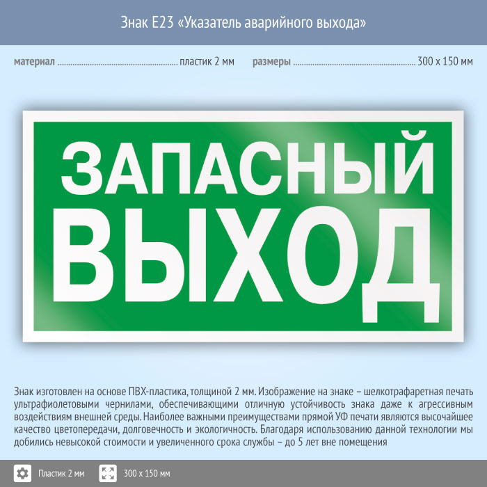 Знак E23 «Указатель запасного выхода» (устаревший) (пластик, 300х150 мм) в Лобне купить