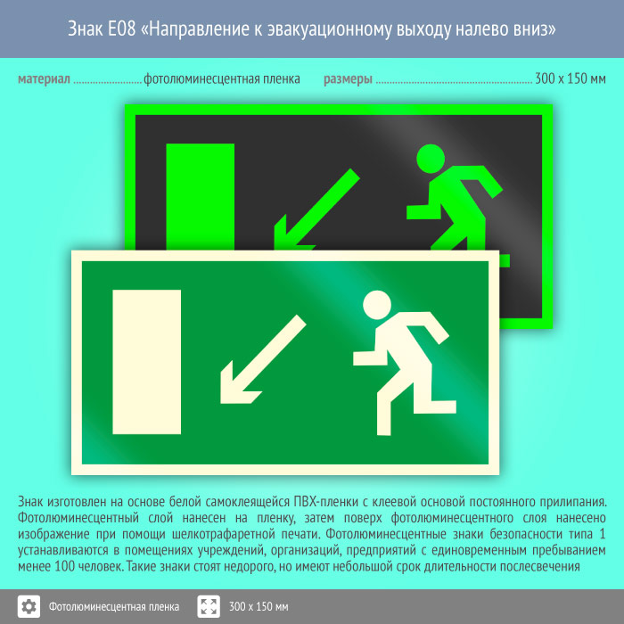 Знак E08 «Направление к эвакуационному выходу налево вниз» (фотолюминесцентная пленка, 300х150 мм) в Лобне купить