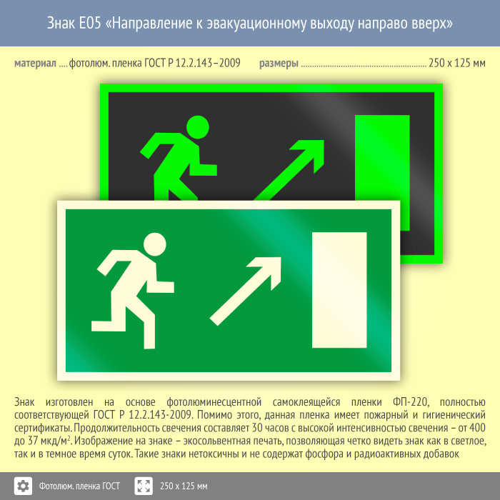 Знак E05 «Направление к эвакуационному выходу направо вверх» (фотолюминесцентная пленка ГОСТ 34428-2018, 250х125 мм) в Лобне купить