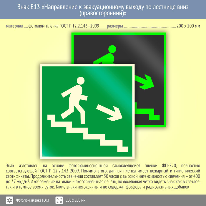 Знак E13 «Направление к эвакуационному выходу по лестнице вниз (правосторонний)» (фотолюминесцентная пленка ГОСТ 34428-2018, 200х200 мм) в Лобне купить