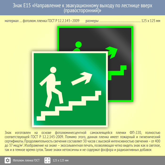 Знак E15 «Направление к эвакуационному выходу по лестнице вверх (правосторонний)» (фотолюминесцентная пленка ГОСТ 34428-2018, 125х125 мм) в Лобне купить