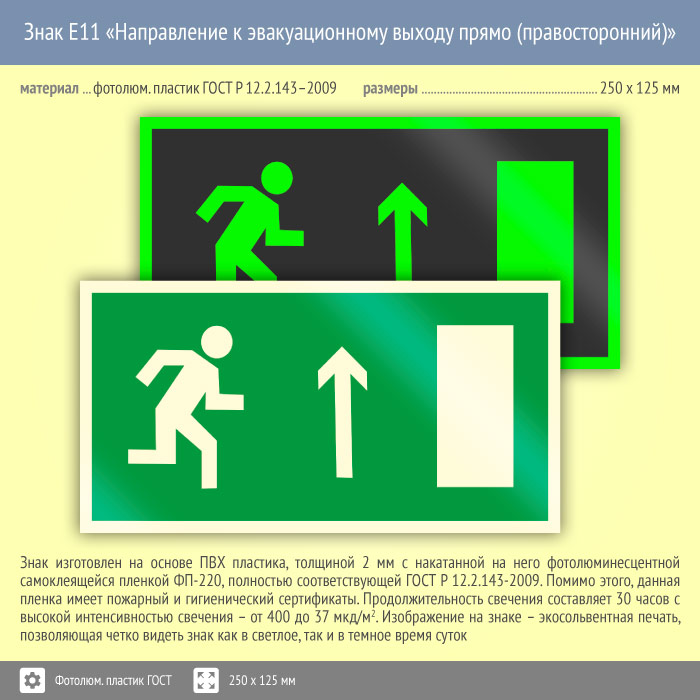 Знак E11 «Направление к эвакуационному выходу прямо (правосторонний)» (фотолюминесцентный пластик ГОСТ 34428-2018, 250х125 мм) в Лобне купить