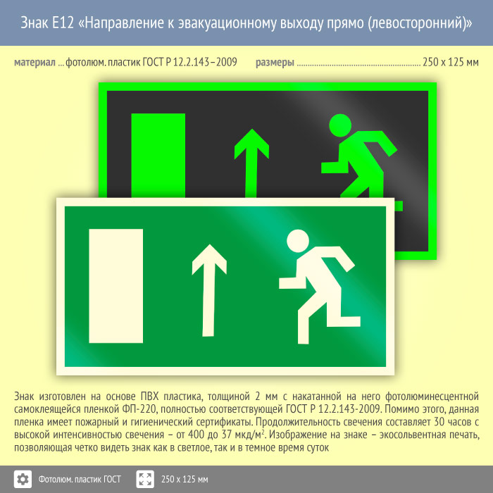 Знак E12 «Направление к эвакуационному выходу прямо (левосторонний)» (фотолюминесцентный пластик ГОСТ 34428-2018, 250х125 мм) в Лобне купить