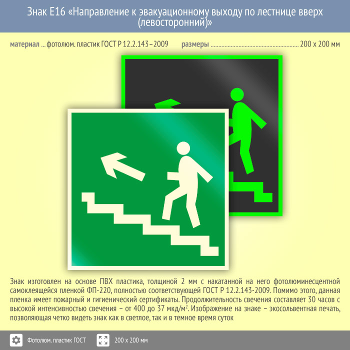 Знак E16 «Направление к эвакуационному выходу по лестнице вверх (левосторонний)» (фотолюминесцентный пластик ГОСТ 34428-2018, 200х200 мм) в Лобне купить