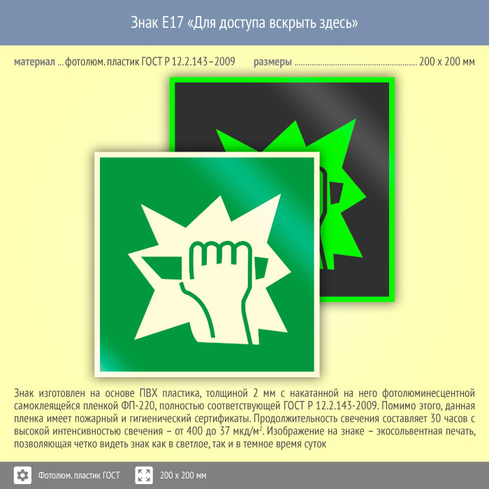 Знак E17 «Для доступа вскрыть здесь» (фотолюминесцентный пластик ГОСТ 34428-2018, 200х200 мм) в Лобне купить