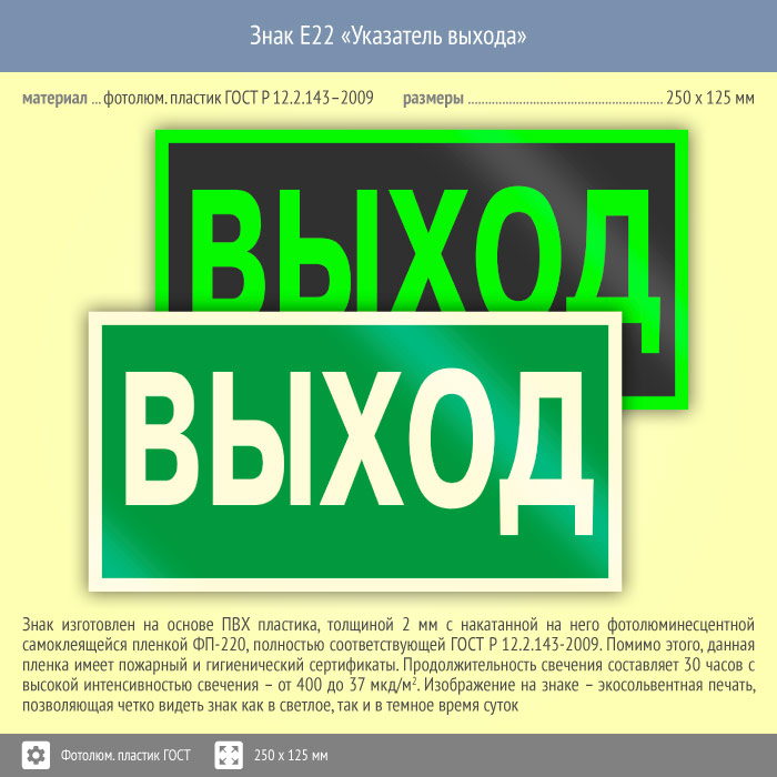 Знак E22 «Указатель выхода» (фотолюминесцентный пластик ГОСТ 34428-2018, 250х125 мм) в Лобне купить
