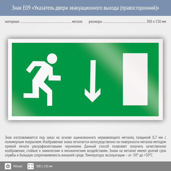 Знак E09 «Указатель двери эвакуационного выхода (правосторонний)» (металл, 300х150 мм) в Лобне купить