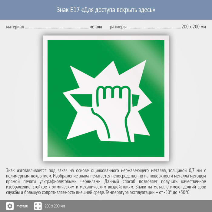 Знак E17 «Для доступа вскрыть здесь» (металл, 200х200 мм) в Лобне купить
