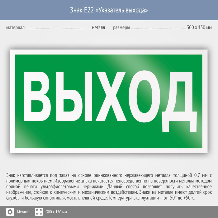 Знак E22 «Указатель выхода» (металл, 300х150 мм) в Лобне купить