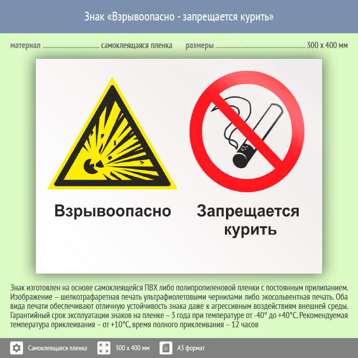 Знак «Взрывоопасно - запрещается курить», КЗ-06 (пленка, 400х300 мм) в Лобне купить