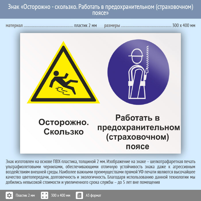 Знак «Осторожно - скользко. Работать в предохранительном (страховочном) поясе», КЗ-58 (пластик, 400х300 мм) в Лобне купить