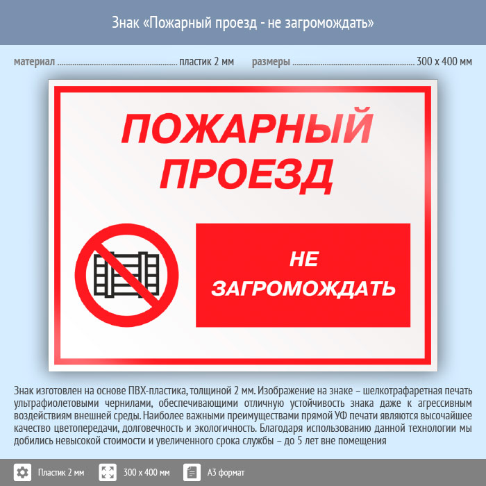 Знак «Пожарный проезд - не загромождать», КЗ-67 (пластик, 400х300 мм) в Лобне купить