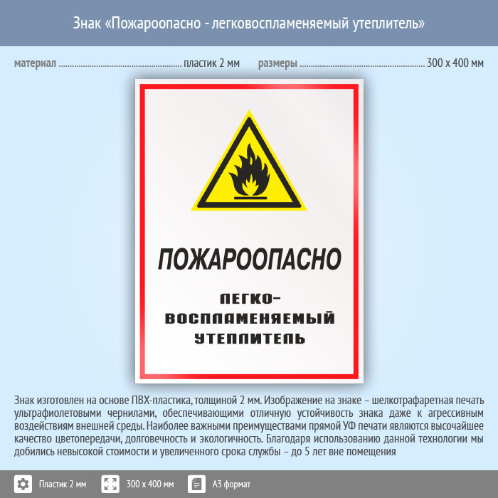 Знак «Пожароопасно - легковоспламеняемый утеплитель», КЗ-68 (пластик, 300х400 мм) в Лобне купить