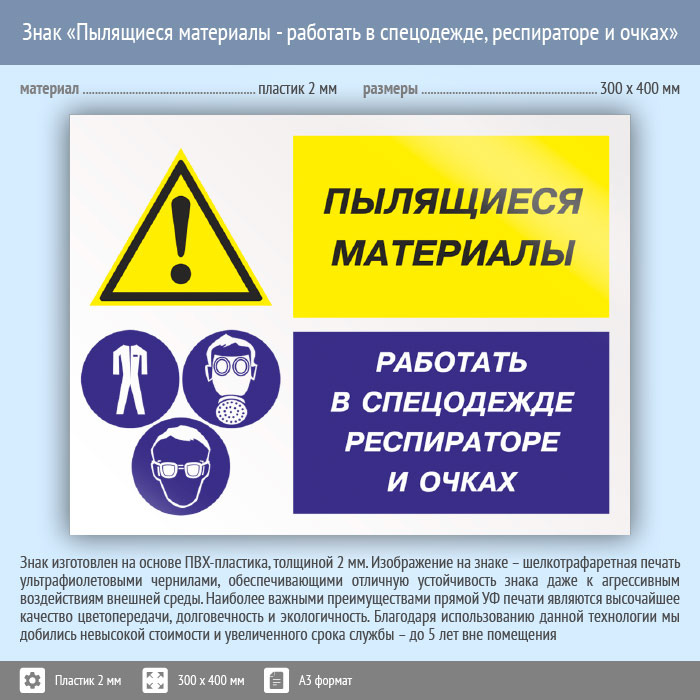 Знак «Пылящиеся материалы - работать в спецодежде, респираторе и очках», КЗ-79 (пластик, 400х300 мм) в Лобне купить