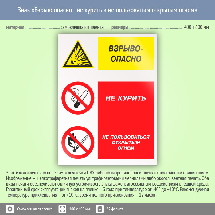 Знак «Взрывоопасно - не курить и не пользоваться открытым огнем», КЗ-08 (пленка, 400х600 мм) в Лобне купить