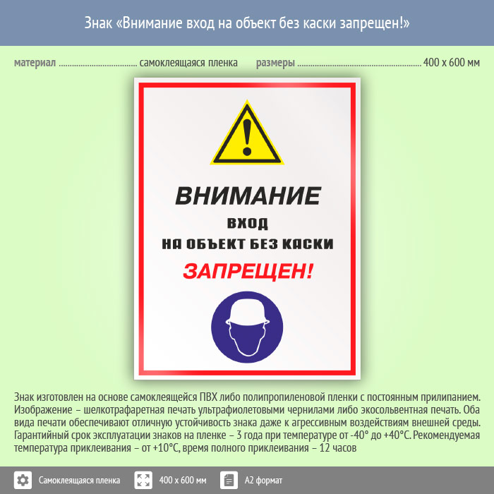 Знак «Внимание вход на объект без каски запрещен!», КЗ-13 (пленка, 400х600 мм) в Лобне купить