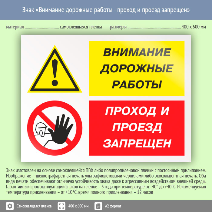 Знак «Внимание дорожные работы - проход и проезд запрещен», КЗ-14 (пленка, 600х400 мм) в Лобне купить