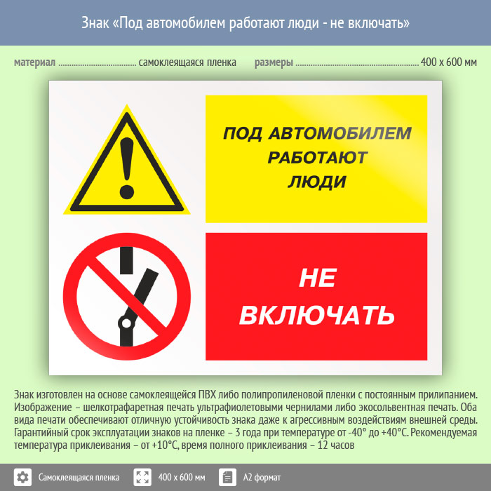Знак «Под автомобилем работают люди - не включать», КЗ-65 (пленка, 600х400 мм) в Лобне купить