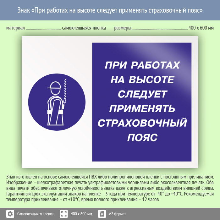 Знак «При работах на высоте следует применять страховочный пояс», КЗ-75 (пленка, 600х400 мм) в Лобне купить