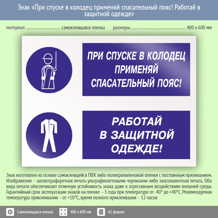 Знак «При спуске в колодец применяй спасательный пояс! Работай в защитной одежде», КЗ-76 (пленка, 600х400 мм) в Лобне купить