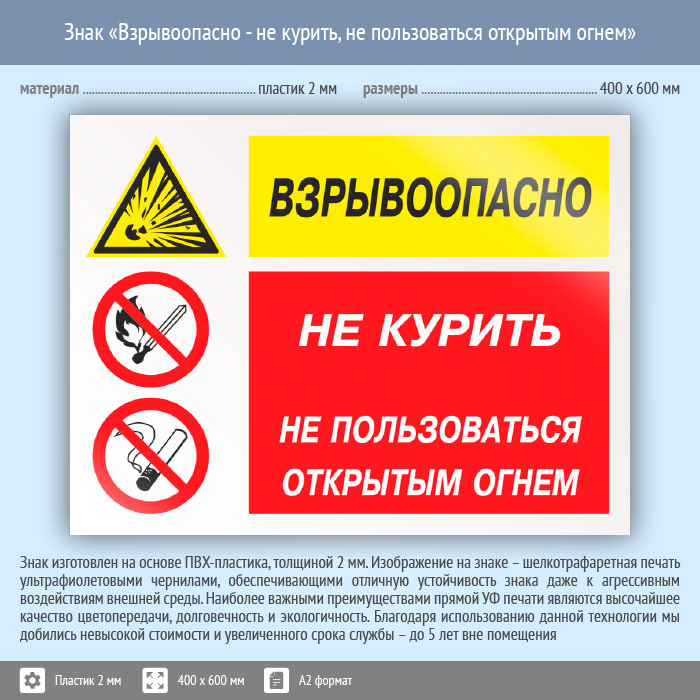 Знак «Взрывоопасно - не курить, не пользоваться открытым огнем», КЗ-05 (пластик, 600х400 мм) в Лобне купить
